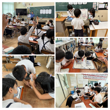 閉じ込めた空気の中に、4つのもの「風船・あわ・スポンジ・マシュマロ」を入れて空気を押したとき、中の空気はどんな変化をしているのか班で協力して調べました。そして、実験結果をボードに書き込み、ほかの班と交流していました。子どもたちは、一人ひとりがよく考えて積極的に取り組んでいました。