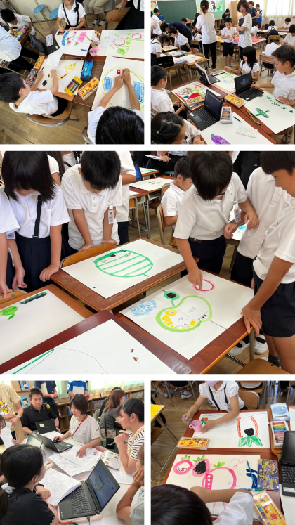 子どもたちは、イメージを膨らませて書いたワークシートをもとに、パスやカラーペン、共同絵の具などを使って、びっくりやさいの想像を広げながら夢中になって取り組んでいました。