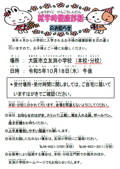 来年度、友渕小学校に入学される保護者の皆様に「就学時健康診断」のお知らせです。