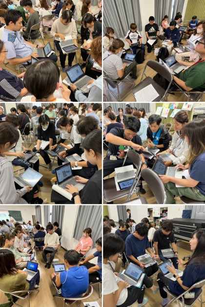 授業には、参観者全員がタブレットを持ち、子どもの活動の写真を撮っていました。討議会では、授業中に撮った写真や子どもが発揮していた力についてコメントを添え、各自がパワーポイントにまとめ、グループで討議しました。グループ討議後には、全体で交流しました。