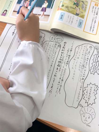 いっしょに道徳の教科書の物語を読んで、登場人物の気持ちを考えます。そして、先生手作りのワークシートを使って、自分の考えをまとめていきます。先生の発問にも、子どもたちはどんどん発表していました。
