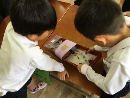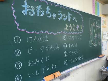 そこで、2年生では、箱やペットボトルなど、身近にあるものを使っておもちゃを作りました。今日は、教室がそのおもちゃで遊べる「おもちゃランド」に変身。1年生を招待しておもちゃランドを楽しんでもらいました。