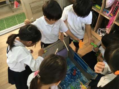 「身近な自然を利用したり、身近にある物を使ったりなどして、遊びや遊びの使うものを工夫し、その面白さや自然の不思議さに気付き,みんなで遊びを楽しむことができるようにする。」