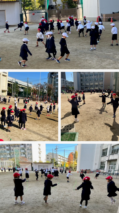 休み時間は、たくさんの子どもたちが運動場に出て、なわとびやドッジボールをしていました。元気いっぱいに過ごしています。
