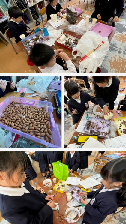 「秋の自然でおもちゃを作ろう!」 どんぐりや松ぼっくりを使って、おもちゃを作っていました。
