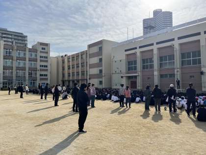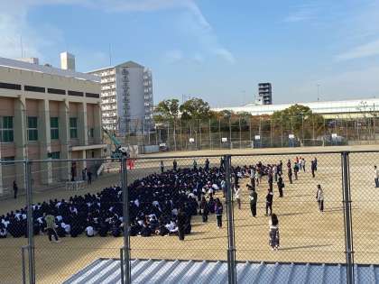都島警察署のご協力のもと、不審者が来たことを想定し、安全が確認されたという放送のあと、運動場に避難しました。