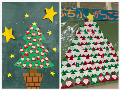 また、1年生の教室や図書室にクリスマスツリーの掲示をしていました。よーく見ると、サンタクロースの顔がとってもかわいいです。