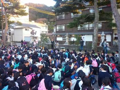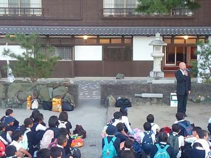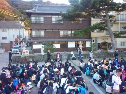 宿舎前の広場で開舎式をおこない、代表の児童が今日から一泊二日、お世話になる「海洋楼」の方へあいさつをしました。