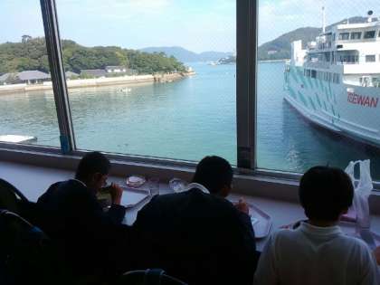 海を眺められるカウンターもある鳥羽水族館内のレストランベイサイドで食べています。