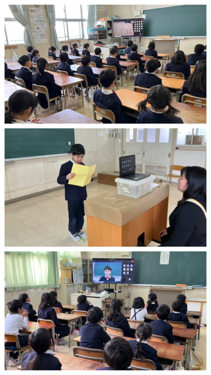 また、「1年間を振り返って」の作文を、分校を代表して2年の児童が、本校を代表して5年の児童がとても上手に発表しました。教室では、児童の発表を静かに聞いていました。
