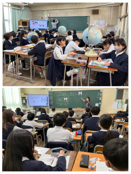 5年生は、社会科の学習で地球儀を使いました。地球儀と地図のいいところを発表していました。