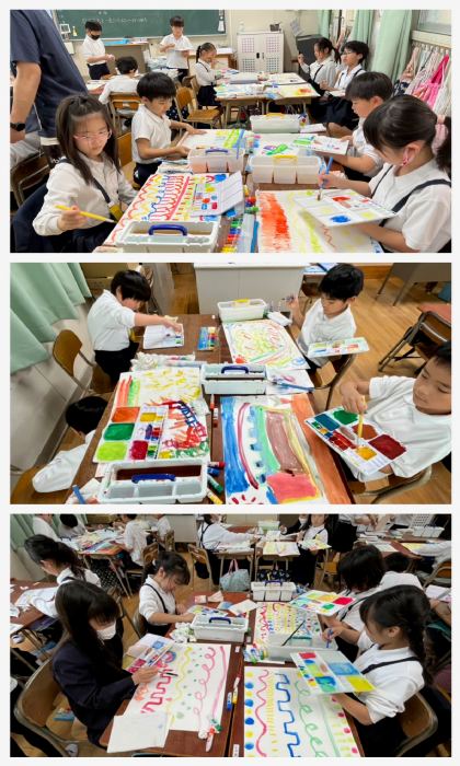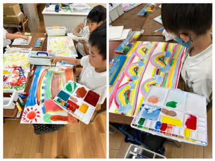 子どもたちは、色の感じ、形の感じ、いろいろなかき方を試しながら、どんどんかき進めていました。