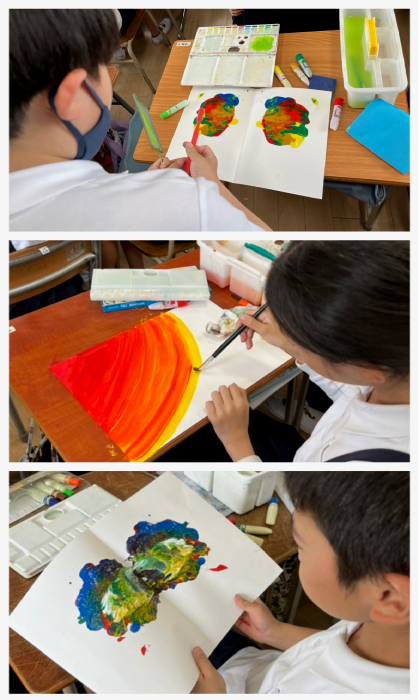 図画工作科の授業では、絵の具を使ってドリッピングやデカルコマニー、スパッタリングなどを試していました。