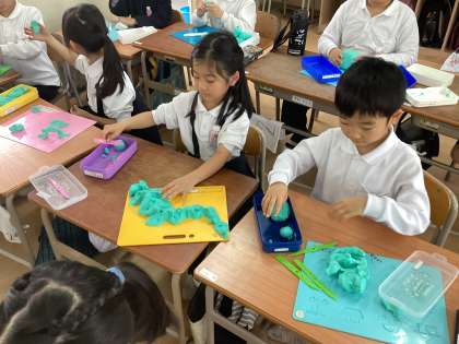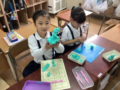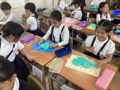 図画工作科「ねん土がうごき出す!」では、粘土をぎゅーっと握ったり、ぐーっと押したりするなど、体全体を使って、思いのままに色々な形を作っていました。