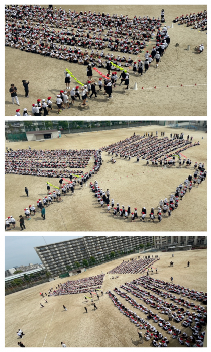 1年生と6年生、2年生と4年生、3年生と5年生のペア学年で並びました。