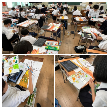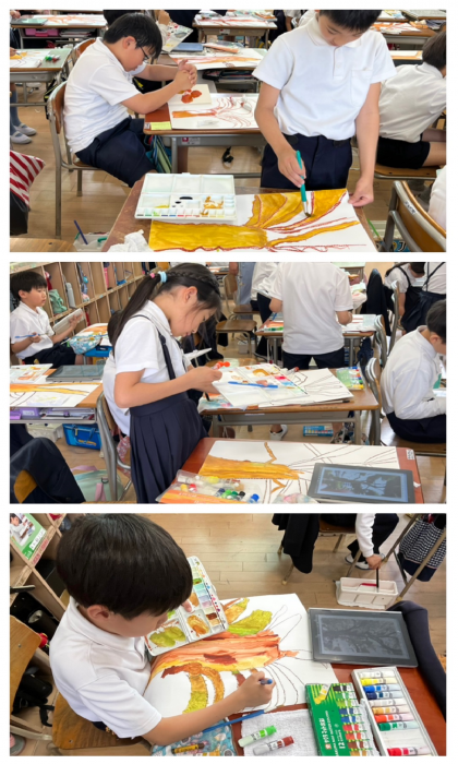正門にある木をタブレット端末で撮影して、絵に表していました。茶色だけではなく、黄色や黄緑、赤などいろいろな色を混色しながら色を重ねていきました。どの子も、夢中で取り組んでいました。