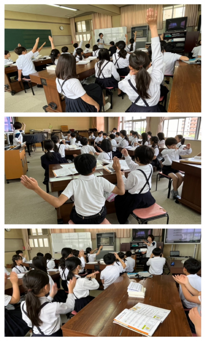 「ラバーズコンチェルト」と「メヌエット」を鑑賞して、4拍子と3拍子の指揮の動きを全員でやってみました。