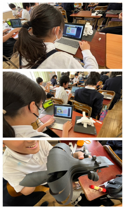 「自分の作品のすごいところ」と「友だちの作品をみて」の欄に入力し、先生に提出していました。