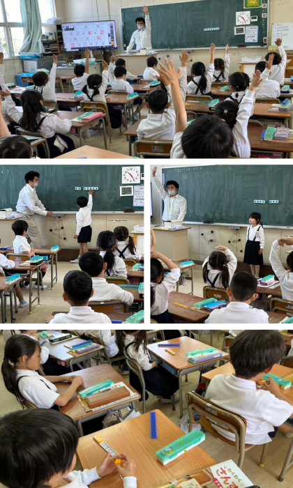 子どもたちは、自分のブロックを動かして考え、発表していました。