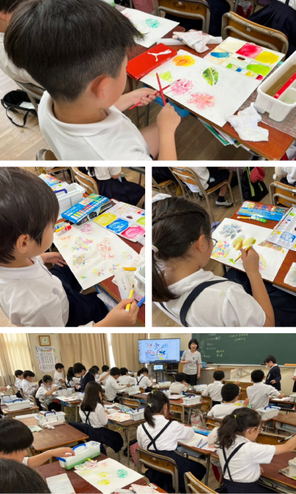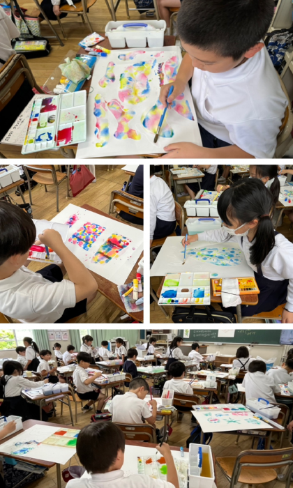 画用紙の上に水たまりを作って絵の具を少しおくと、にじんでいくのがおもしろい活動です。子どもたちは、楽しみながら進めていました。