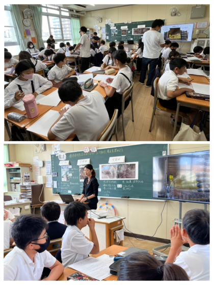 作品の写真を見て、第一印象や想像したことをワークシートにどんどん書いていきました。そして、書いたことをグループで交流しました。