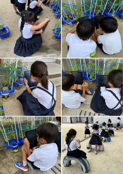 生活科の時間に、ミニトマトの観察をしました。 タブレットでミニトマトを写真に撮って生長を記録しています。