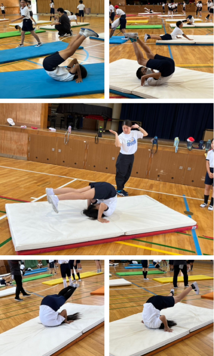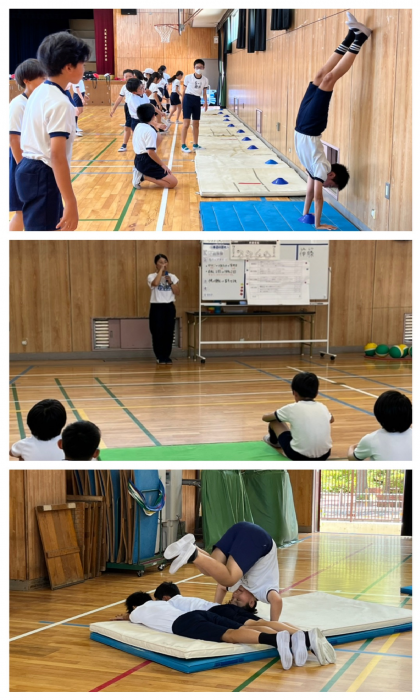子どもたちは、伸膝後転(しんしつこうてん)や壁倒立、跳び前転、倒立前転など、様々な技に取り組んでいました。