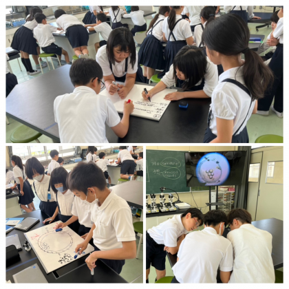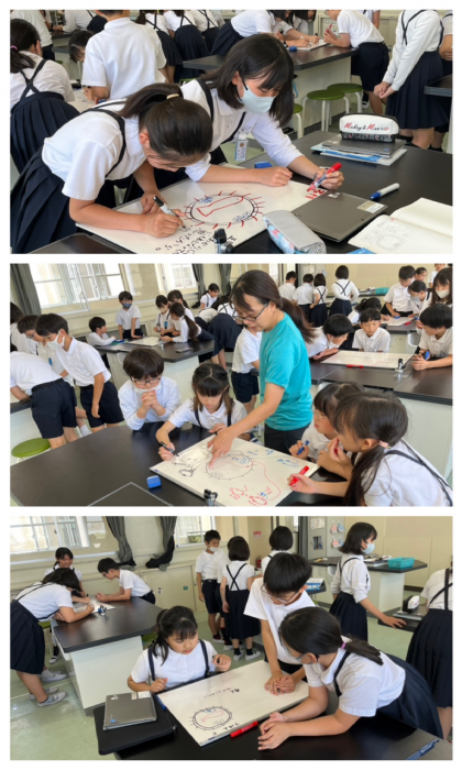 顕微鏡で見たメダカのたまごが数時間後にどうなるか、子どもたちは今までの経験や知識から予想しました。そして、子どもたちはホワイトボードに予想と理由をどんどん書いていきました。