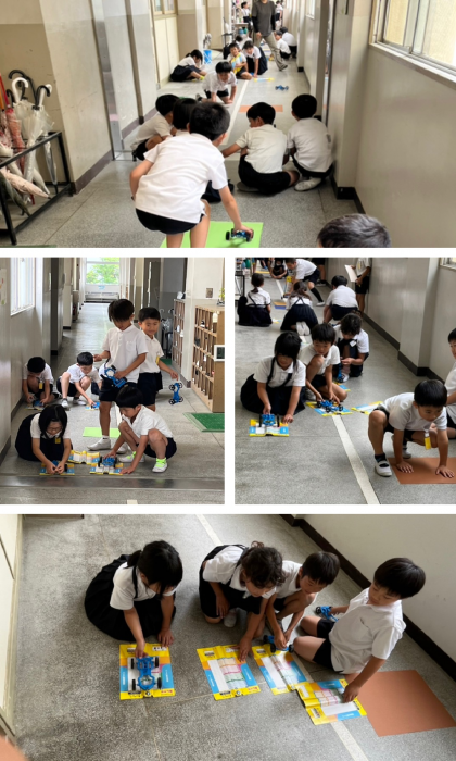 子どもたちは教室前の廊下で、ゴムの力で車を動かす実験をしました。