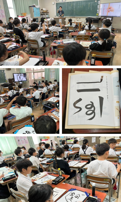 初めての毛筆。筆の持ち方や始筆の筆のおき方を学習しました。先生の話をよく聞いて取り組んでいました。