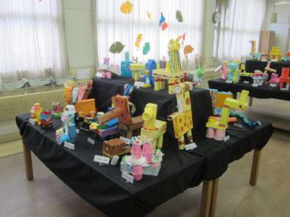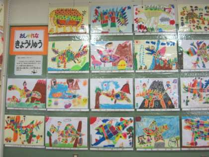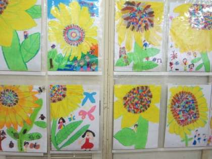 1年生は「ひまわり」「おしゃれなきょうりゅう」「どうぶつ 大すき」の作品を展示しています。自分の思いをのびのびと表現しています。