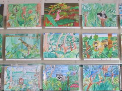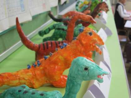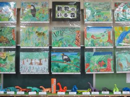 4年生は「ふしぎなきょうりゅう」「動物のいる森」の作品を展示しています。