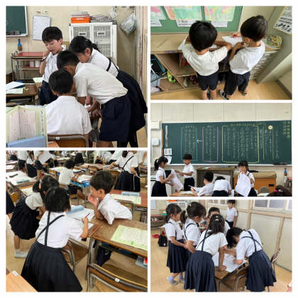 子どもたちは、習った漢字を書いたり、点や丸を付け加えたりしていました。みんな、真剣に友だちの文章を読んで校正していました。