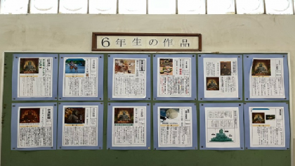 階段の掲示板に6年生が作った歴史新聞を掲示しています。