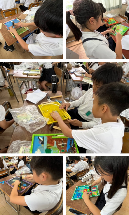 ビー玉を転がして楽しめるように、釘を打つ場所を考えながら作業を進めていました。