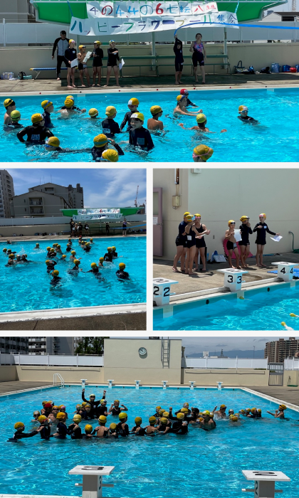 4年生2クラスは、最後の水泳の時間に、子どもたちで企画して「ハッピーフラワープール集会」をしていました。