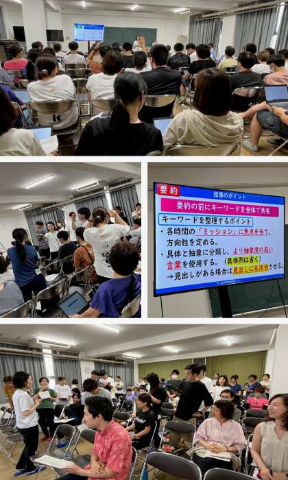 研修では、文章を読んで、書かれていることを50字以上70字以内にまとめ、ペアで話し合った後、グループ、そして全体で発表するといった、普段の授業でも取り入れている方法で活動しました。