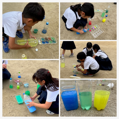 子どもたちは、色水を透明の容器に入れて並べたり、色の仲間をつくったりして活動を楽しんでいました。