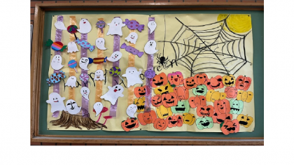 10月になり、玄関掲示がハロウィーンに変わりました。