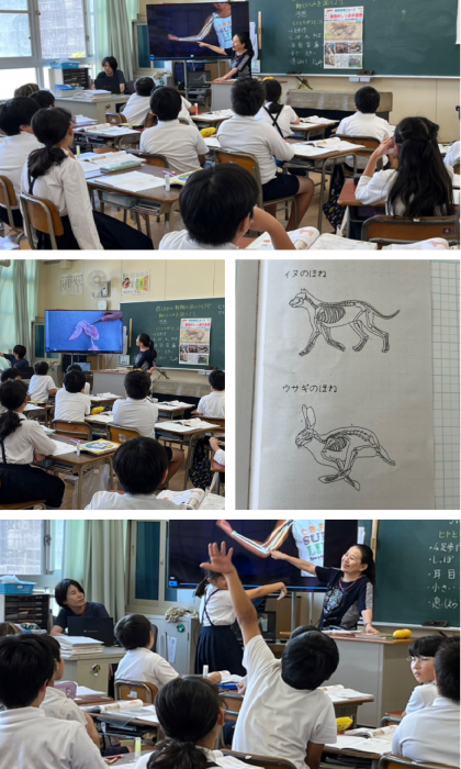 今日の授業では、ほかの動物の体のつくりや動くしくみを考えました。ヒト以外の動物にも、骨、関節、筋肉があり、体を支えたり動かしたりしていることがわかりました。
