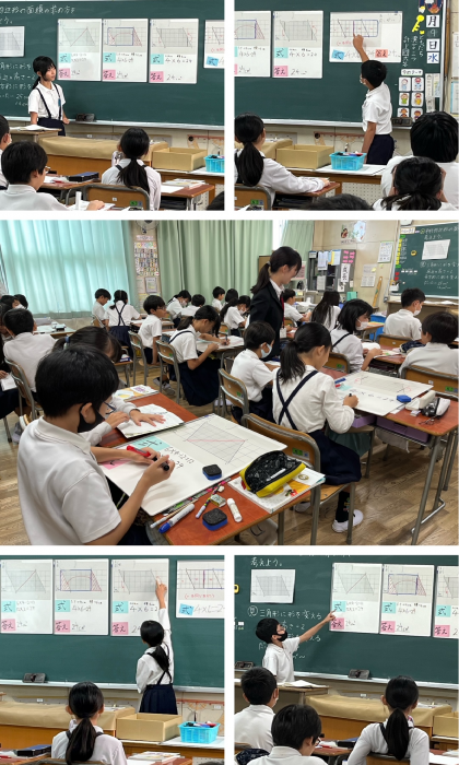 まず自分で面積の求め方を考え、それから自分の考えを班で共有しました。班内で出てきた4つの考えを全体で発表しました。