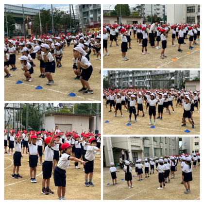 1年生は、全クラスが運動場に出て、ラジオ体操や回れ右の練習をしていました。