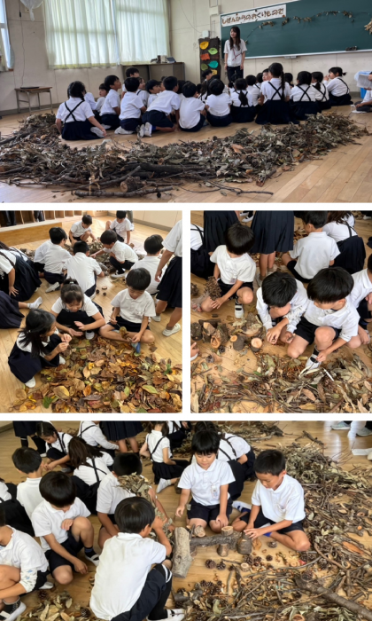 この題材は、落ち葉や草花、木の実などの自然の材料と触れ合いながら、形や色、並べ方や組み合わせ方など、自分ならどのようなことをしてみたいか考えてつくる造形あそびの活動です。