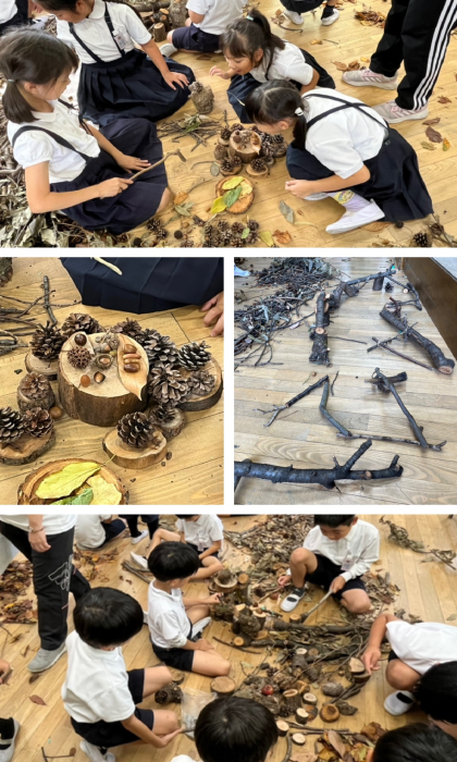 子どもたちは、落ち葉やどんぐり、栗、ザクロなどの材料を集めていました。