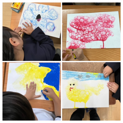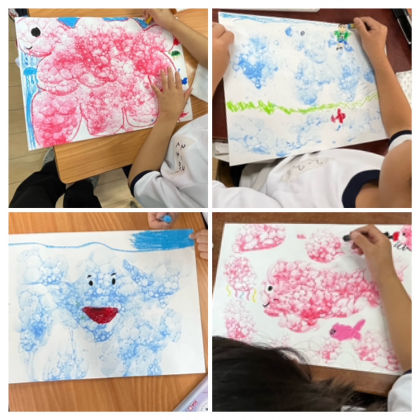 画用紙の上で、もくもくとあふれる泡が乾き、いろいろな形ができました。その形を見て、「何に見えるかなあ」と、それぞれの子どもがイメージをしながら、パスでどんどん絵に表していきました。