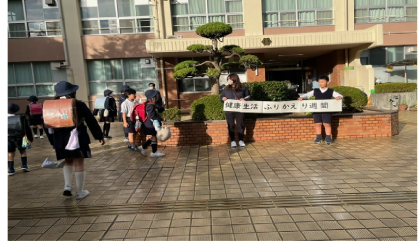 今週は、健康生活ふりかえり週間です。玄関前では、保健委員会の児童が呼びかけていました。