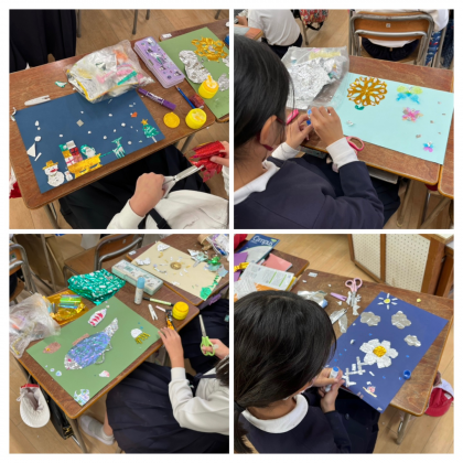 お菓子のキラキラした包装紙やアルミホイルなど、キラキラしたものを色画用紙に貼って、自分のイメージした世界を自由に表現していました。