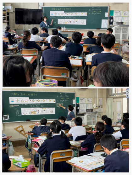 お米の炊き方、煮干しでだしのとり方、具材の油揚げやねぎの切り方を教科書で確認しながら学習しました。調理実習が楽しみです。