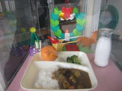 今日の給食の献立は、冬が旬の野菜を使った「ふゆやさいのカレー」「ブロッコリーのサラダ」「みかん」「牛乳」でした。給食当番の子どもたちは、給食室前で大きな声で「いただきます!!」とあいさつをし、教室まで、食器やおかずなどをしっかりと運んでいました。教室では、おいしそうに食べ、おかわりをする子どもたくさんいました。今日で2学期の給食が終了です。