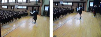 終業式では、冬休みのくらしについて校長先生・教頭先生そして係の先生方からお話がありました。また、各学年から代表の子どもたちが2学期の学校生活の振り返りや冬休みにしたいことなどを発表し、最後に校歌を歌って終業式をしめくくりました。